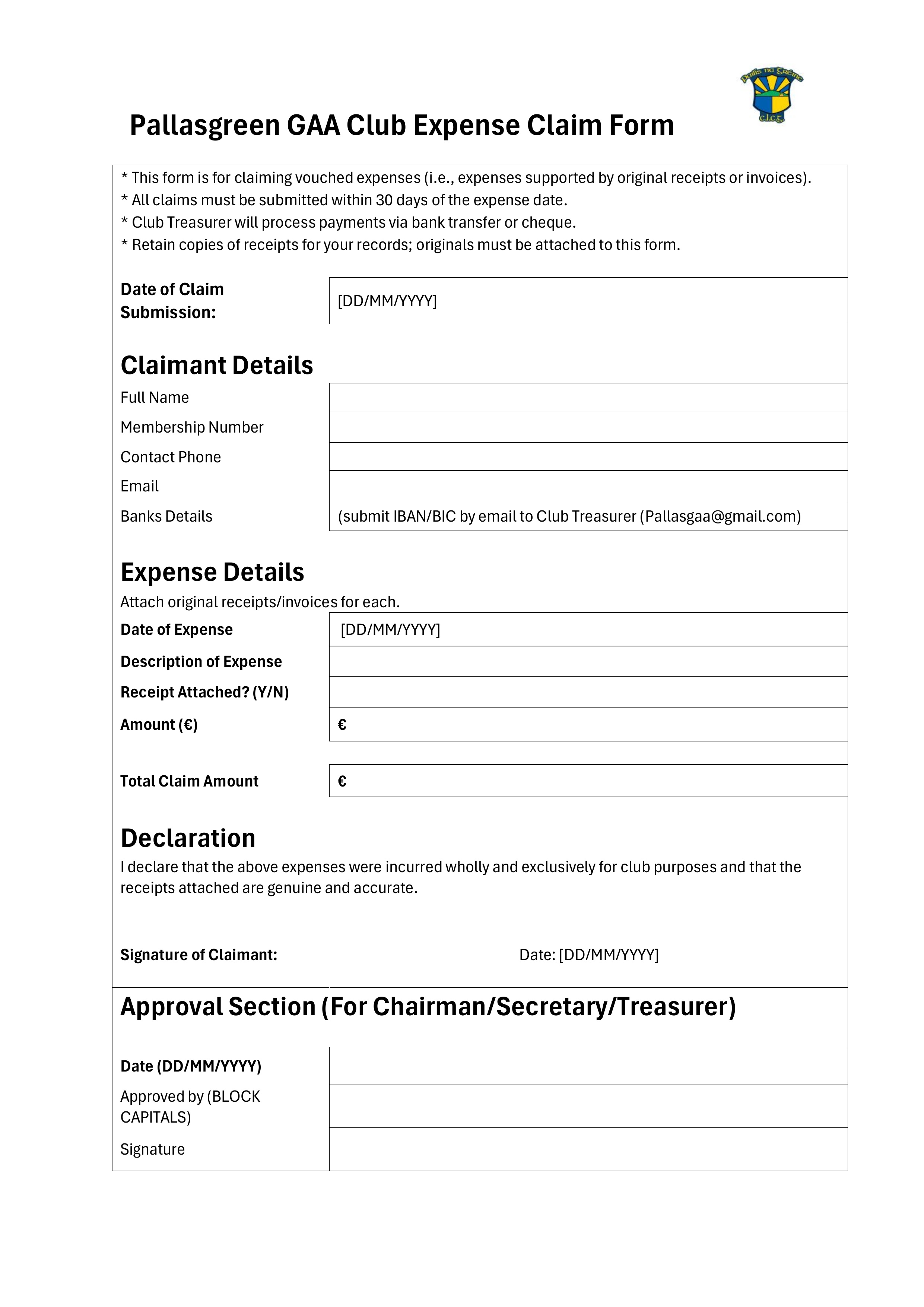 Complete Expense Claim Form for reimbursement of expense incurred wholly and exclusively for club purposes.